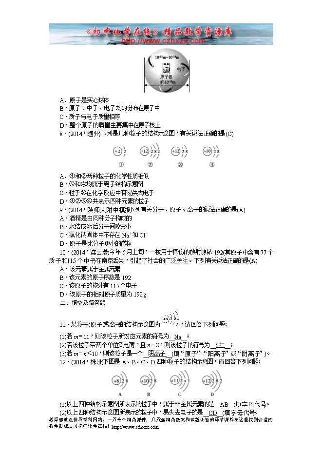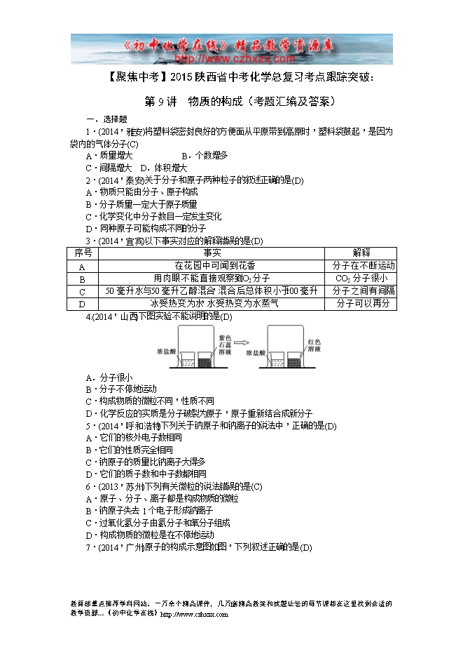 【聚焦中考】2015陕西省中考化学总复习考点跟踪突破:第9讲 物质的构成(考题汇编及答案)