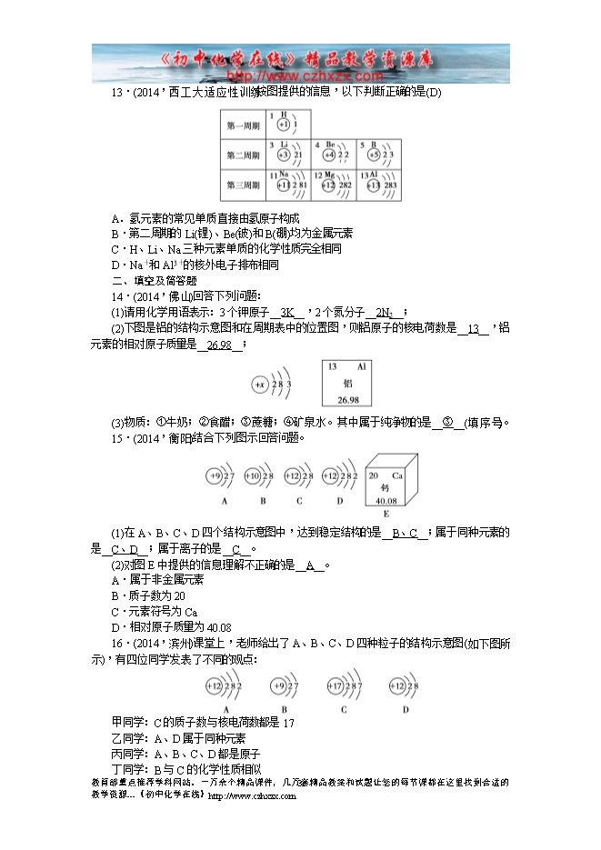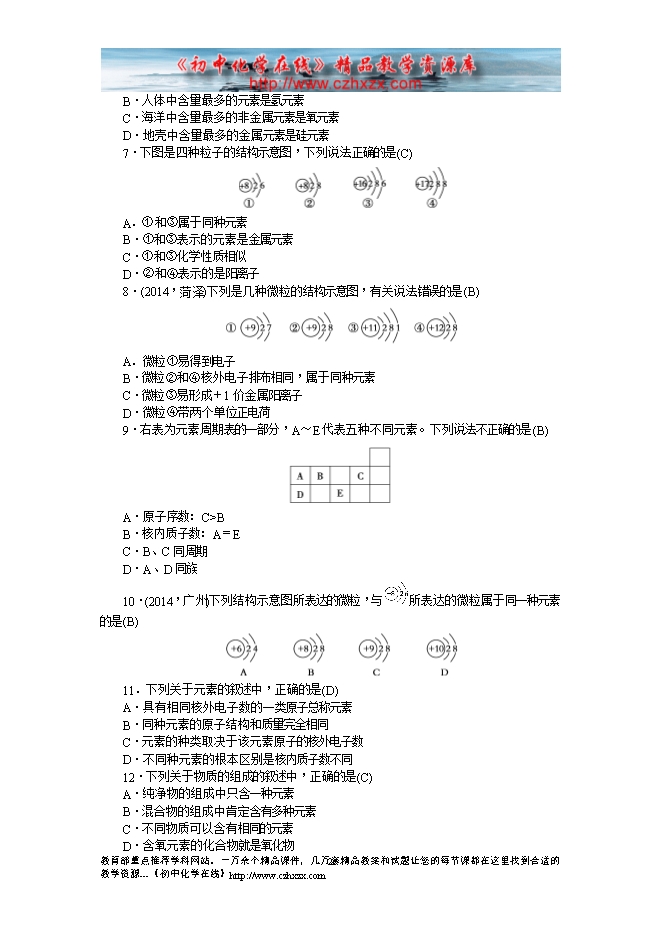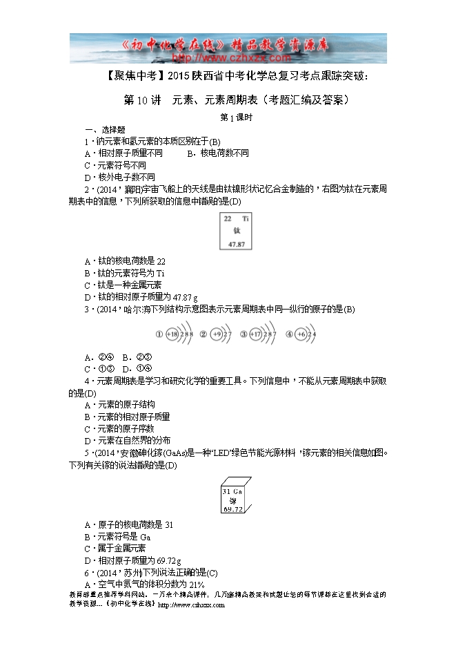 【聚焦中考】2015陕西省中考化学总复习考点跟踪突破:第10讲 元素、元素周期表(考题汇编及答案)