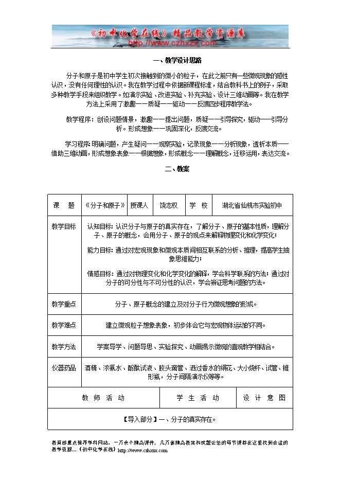人教版《第三单课题1 分子和原子》教学设计(方案二)