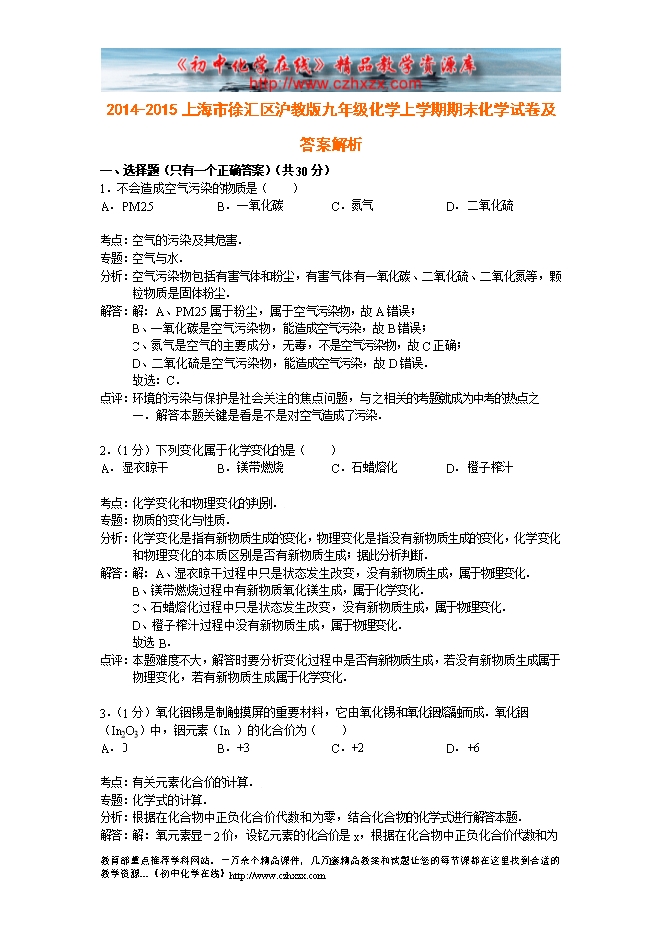 2014-2015上海市徐汇区沪教版九年级化学上学期期末化学试卷及答案解析