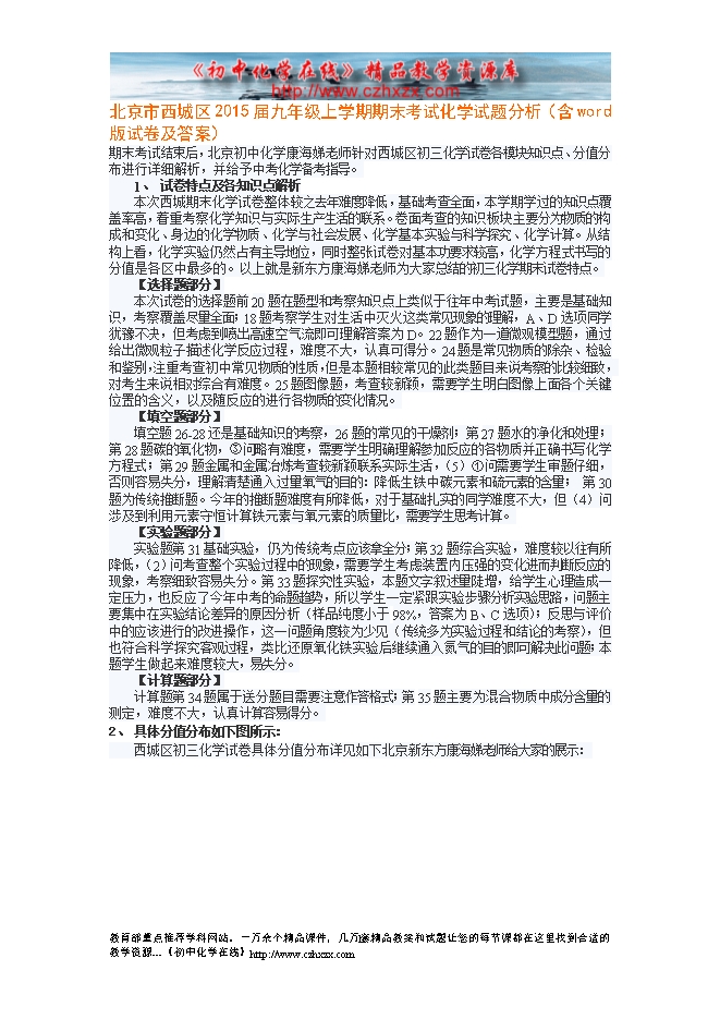 北京市西城区2015届九年级上学期期末考试化学试题分析(含word版试卷及答案)
