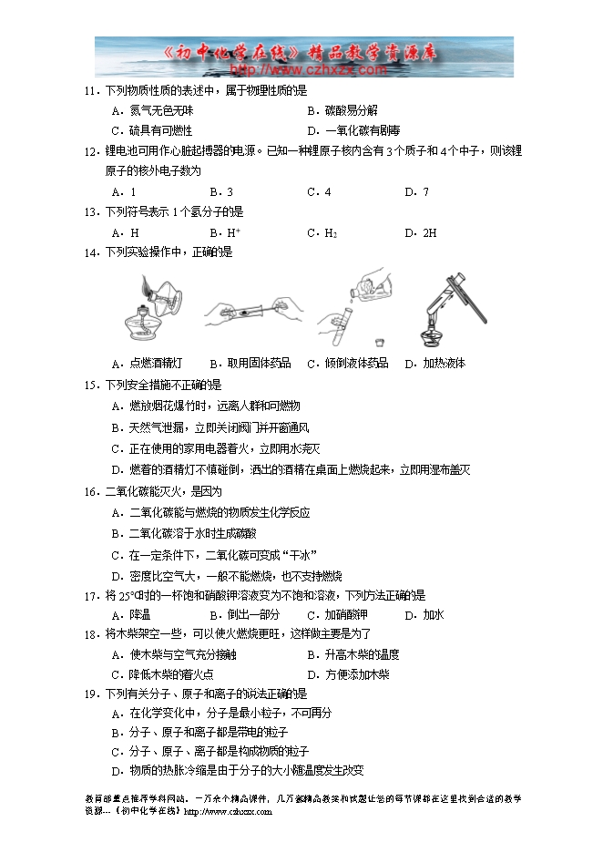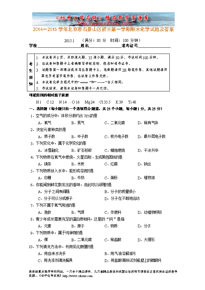 2014-2015学年北京市石景山区初三第一学期期末化学试题及答案