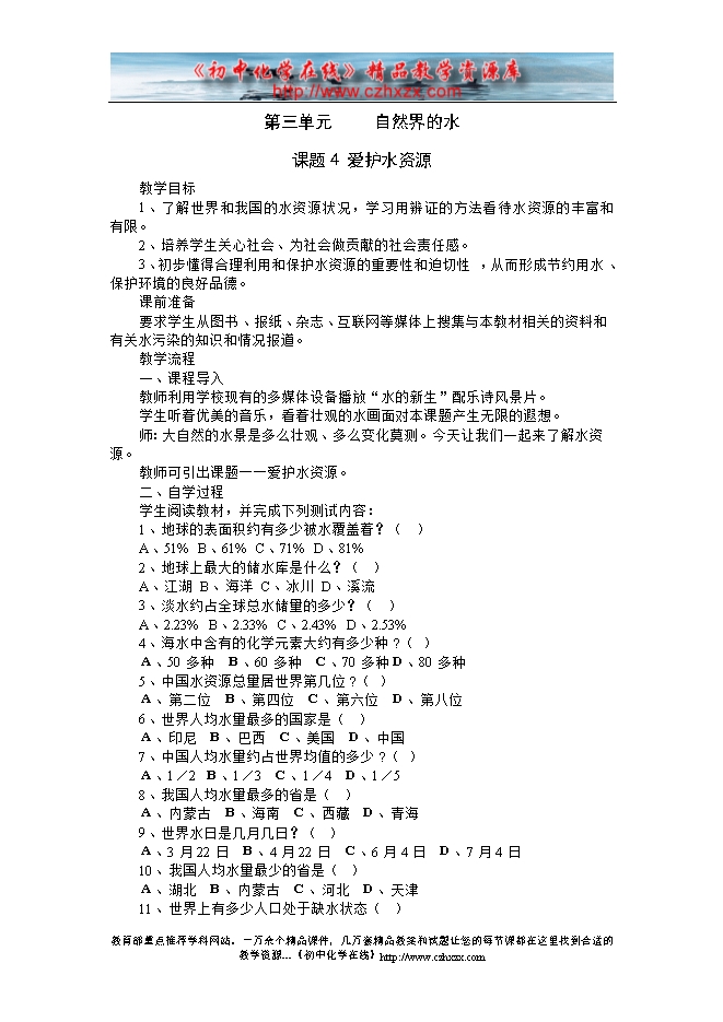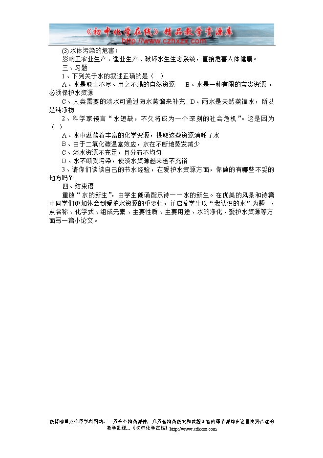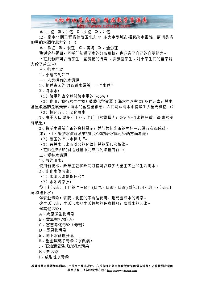 - 上一份资料:人教版《第四单元课题1 爱护水资源》教学设计(方案一)