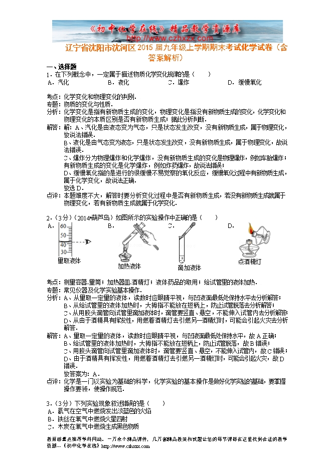 辽宁省沈阳市沈河区2015届九年级上学期期末考试化学试卷(含答案解析)