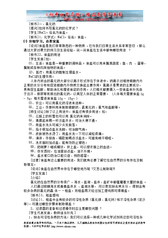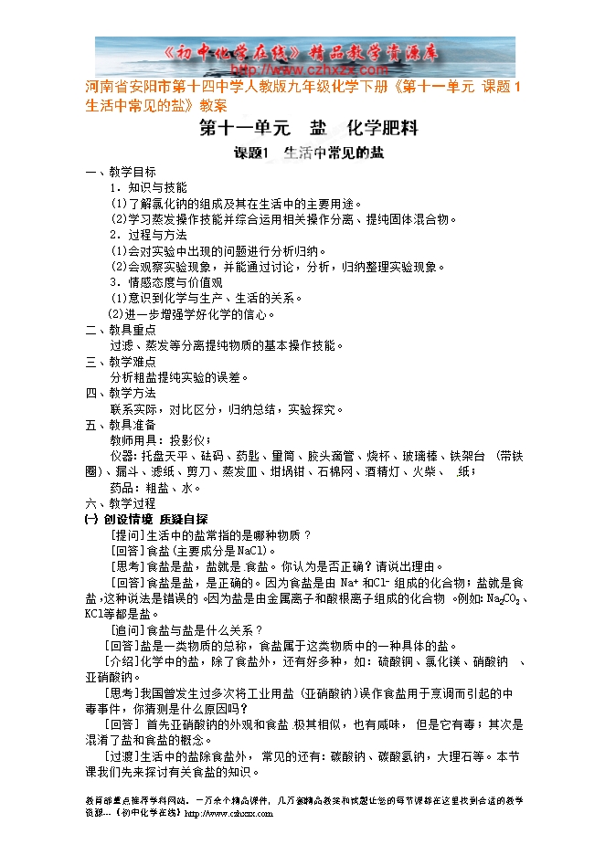 河南省安阳市第十四中学人教版九年级化学下册《第十一单元 课题1生活中常见的盐》教案