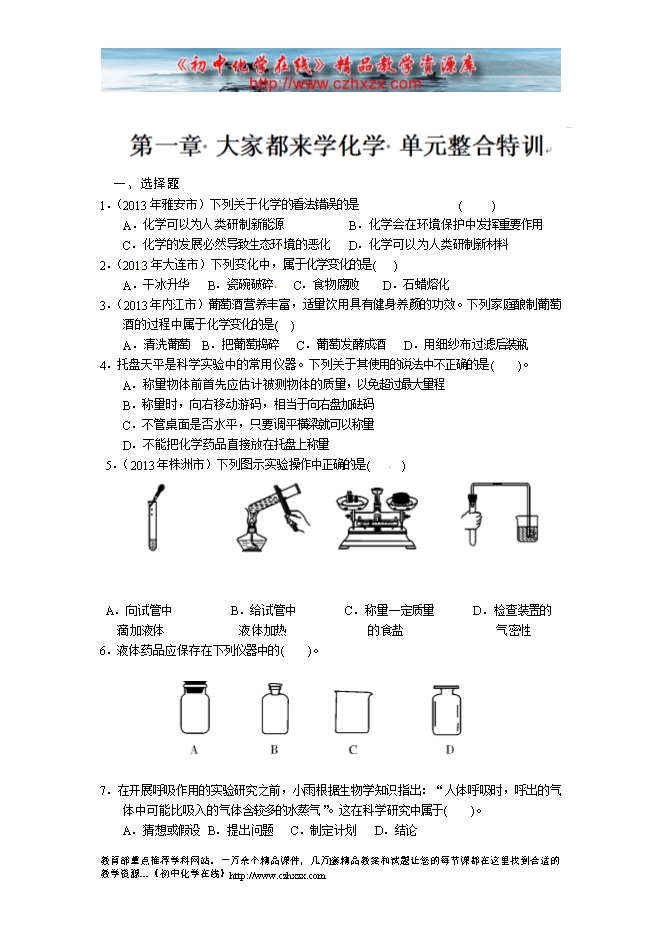 辽宁省凌海市石山初级中学粤教版九年级化学寒假作业:第一章 大家都来学化学 单元整合特训(无答案)