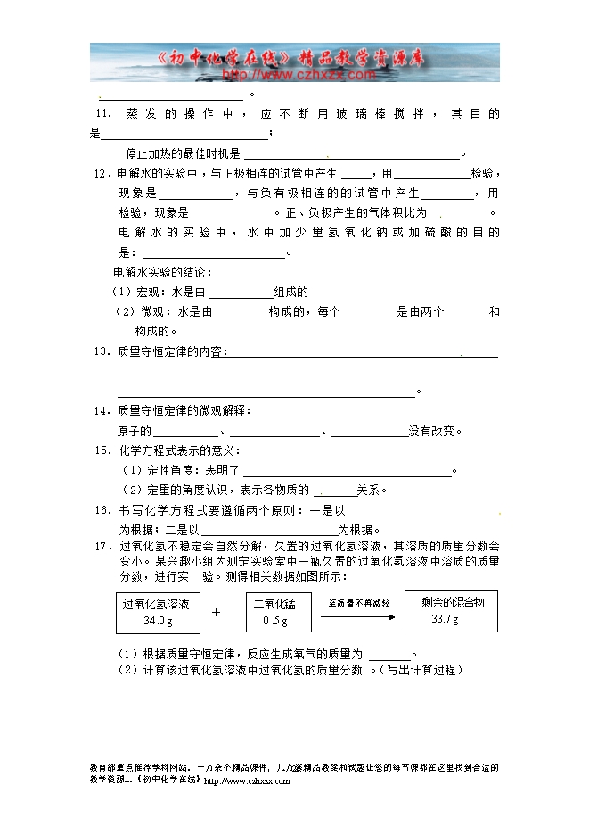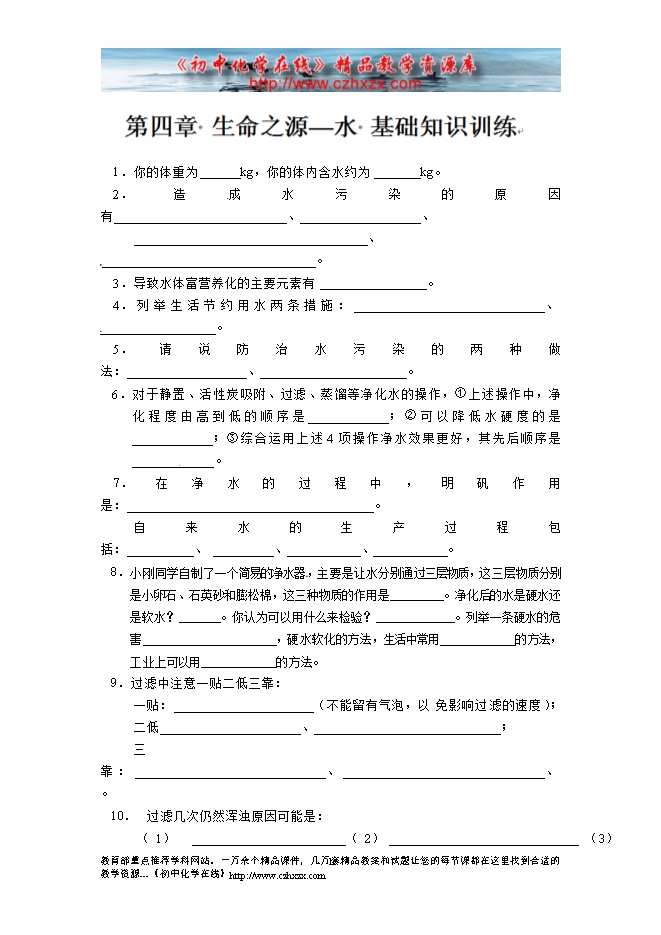 辽宁省凌海市石山初级中学粤教版九年级化学寒假作业:第四章 生命之源—水 基础知识训练(无答案)