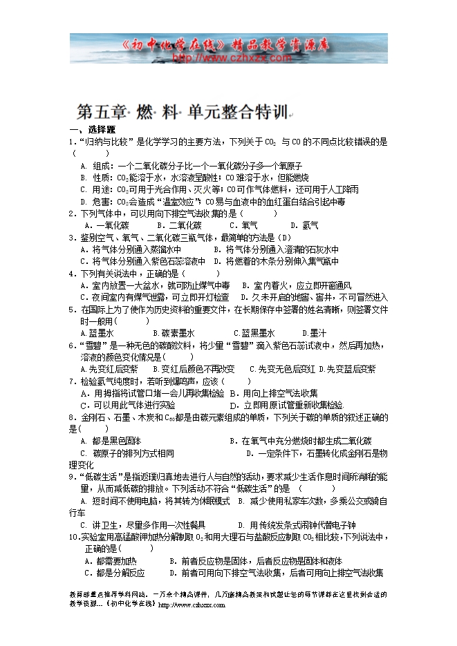 辽宁省凌海市石山初级中学粤教版九年级化学寒假作业:第五章 燃料 单元整合特训(无答案).doc
