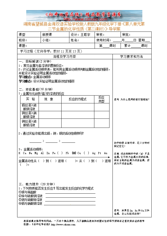 湖南省望城县金海双语实验学校新人教版九年级化学下册《第八单元课题2 金属的化学性质(第二课时)》导学案