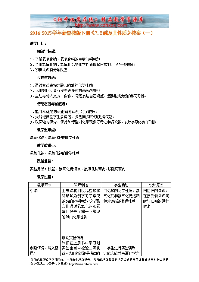2014-2015学年新鲁教版下册《7.2碱及其性质》教案(一)