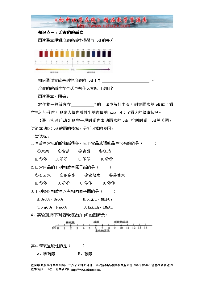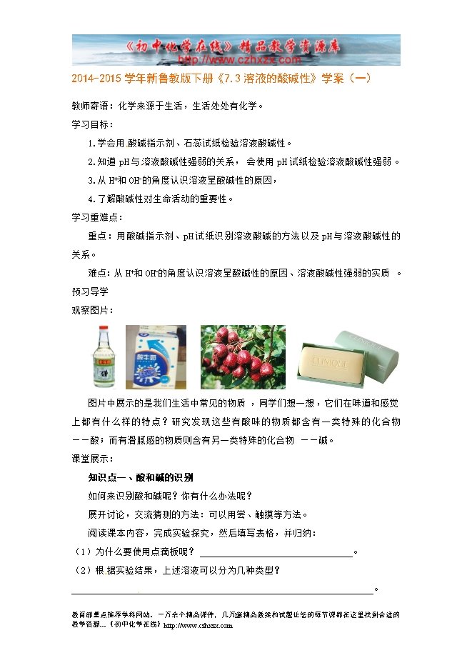 2014-2015学年新鲁教版下册《7.3溶液的酸碱性》学案(一)