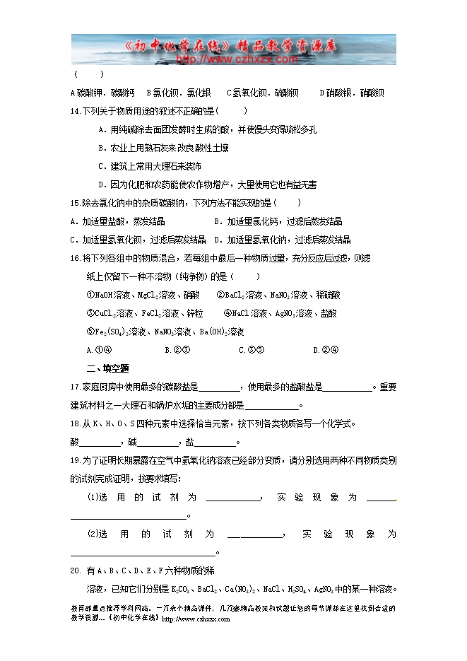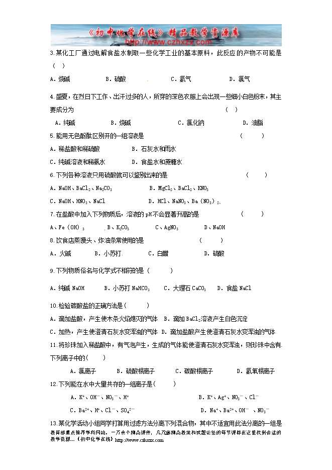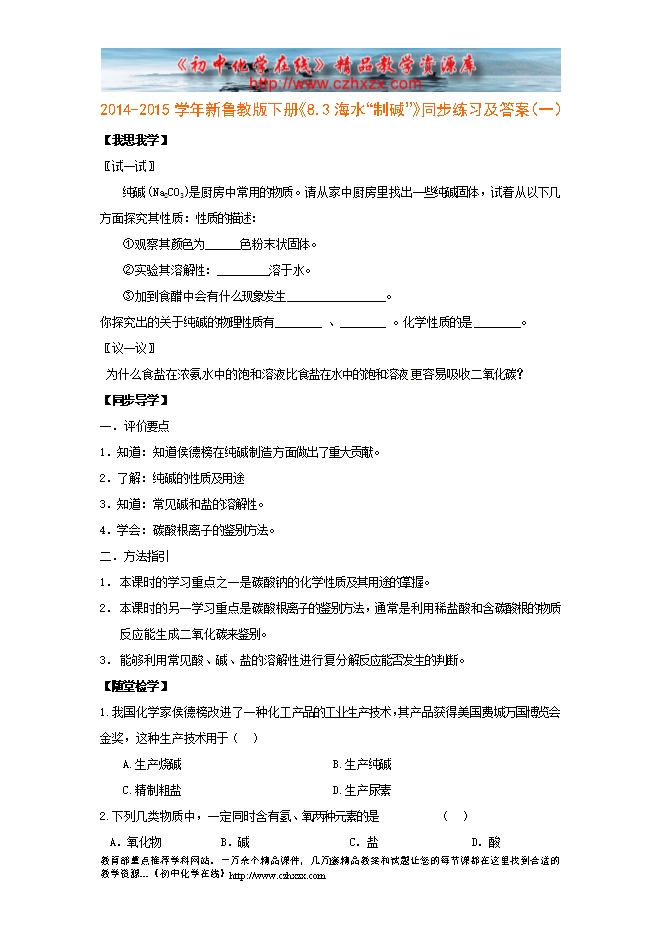 2014-2015学年新鲁教版下册《8.3海水“制碱”》同步练习及答案(一)