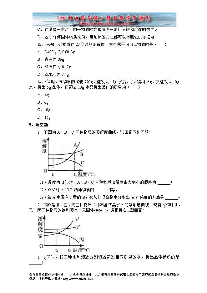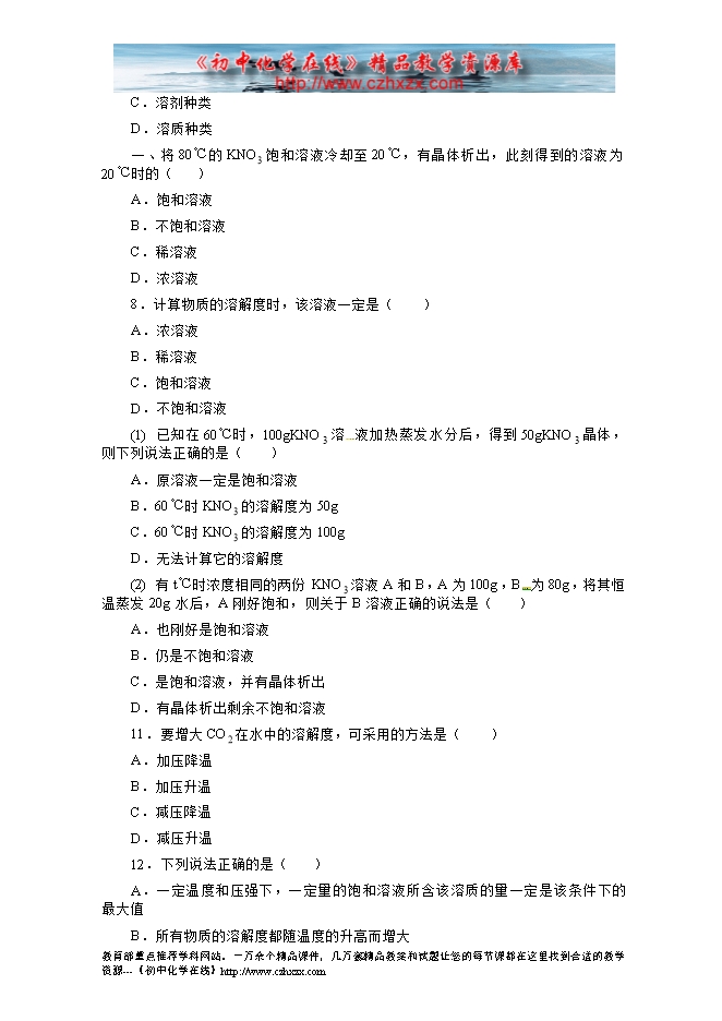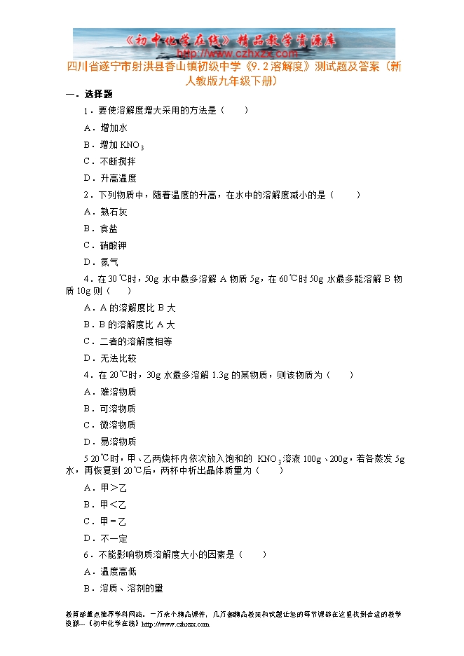 四川省遂宁市射洪县香山镇初级中学《9.2溶解度》测试题及答案(新人教版九年级下册)