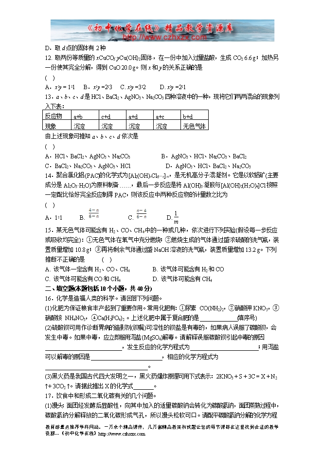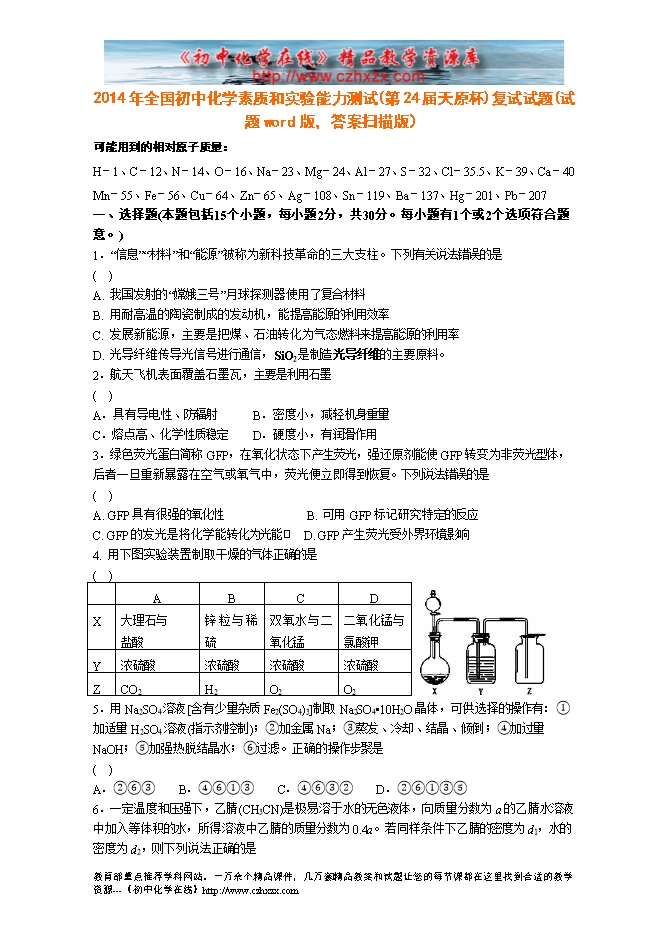 2014年全国初中化学素质和实验能力测试(第24届天原杯)复试试题(试题word版,答案扫描版)