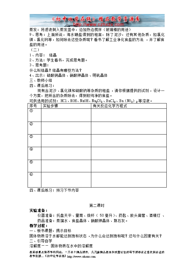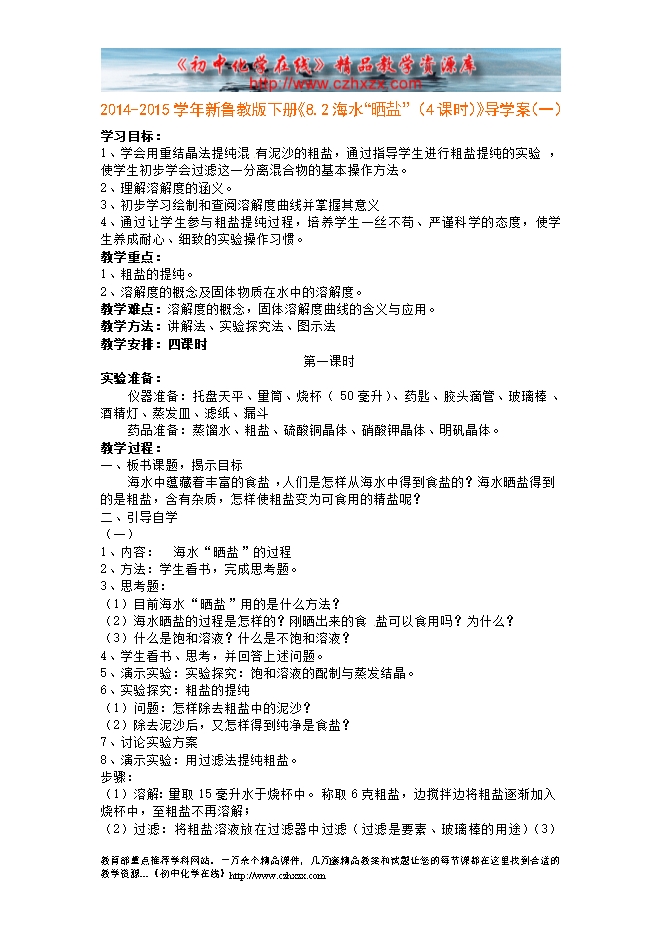 2014-2015学年新鲁教版下册《8.2海水“晒盐”(4课时)》导学案(一)