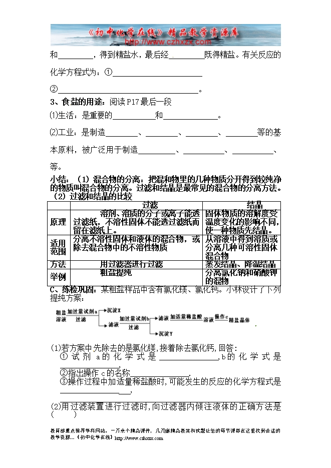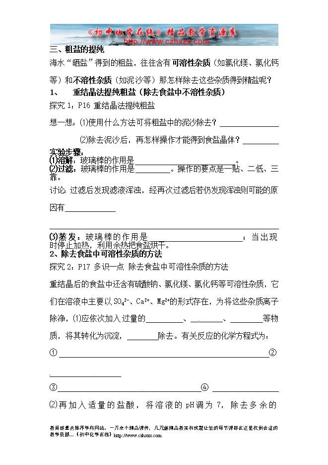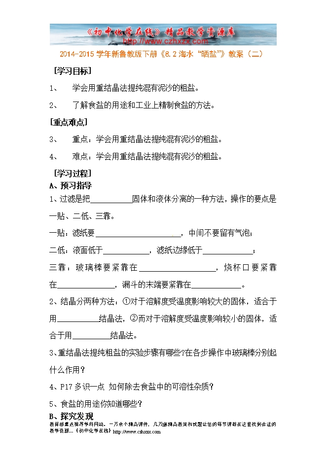 2014-2015学年新鲁教版下册《8.2海水“晒盐”》教案(二)