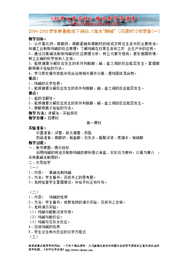 2014-2015学年新鲁教版下册《8.3海水“制碱”(四课时)》导学案(一)