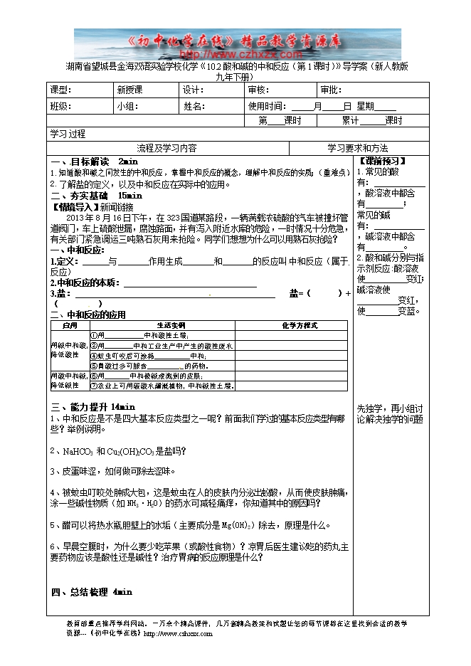 湖南省望城县金海双语实验学校化学《10.2酸和碱的中和反应(第1课时)》导学案(新人教版九年下册)