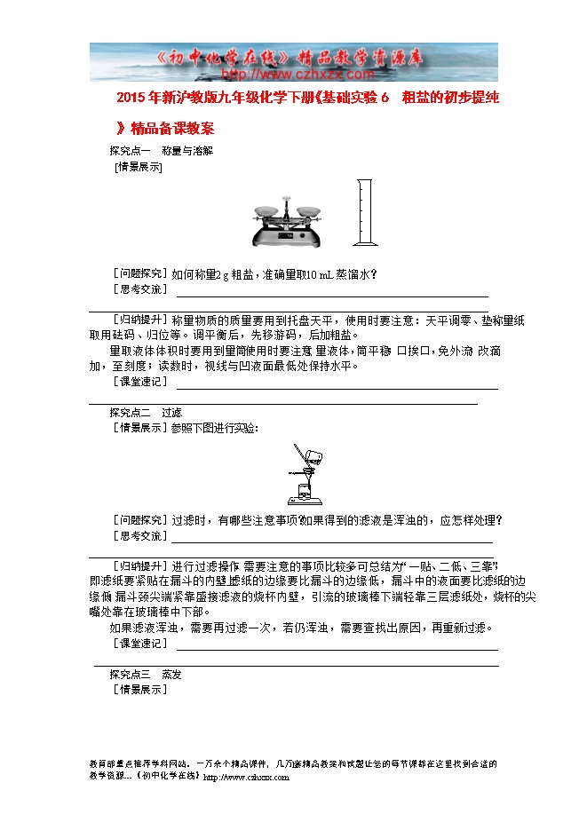 2015年新沪教版九年级化学下册《基础实验6 粗盐的初步提纯》精品备课教案
