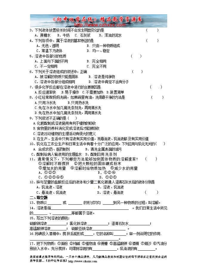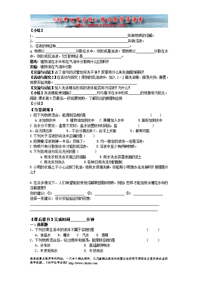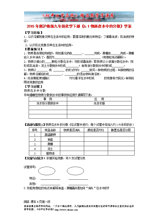 2015年新沪教版九年级化学下册《6.1物质在水中的分散》学案