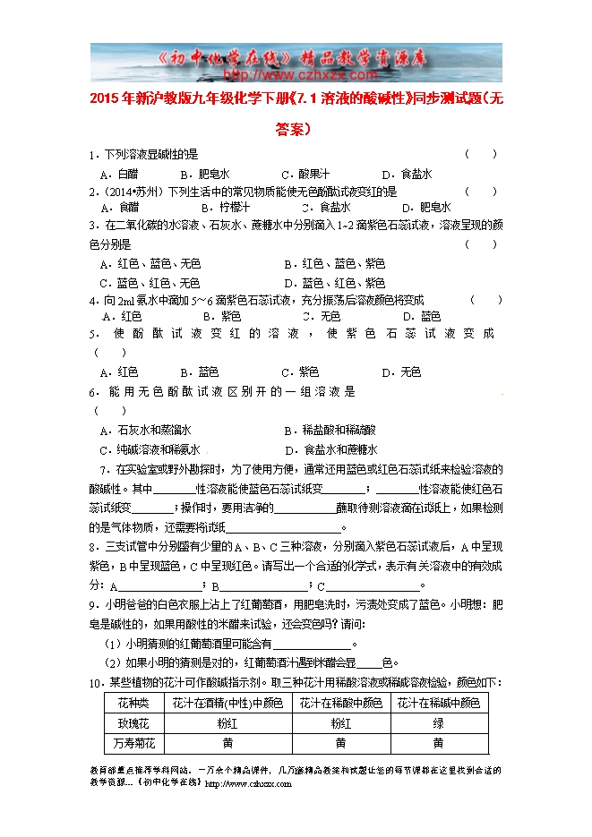 2015年新沪教版九年级化学下册《7.1溶液的酸碱性》同步测试题(无答案)