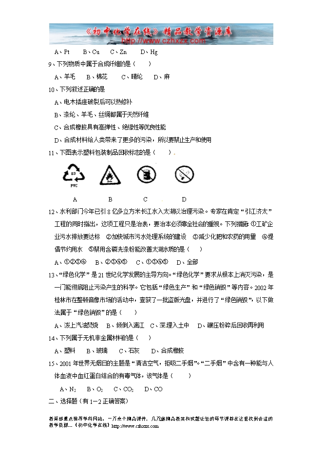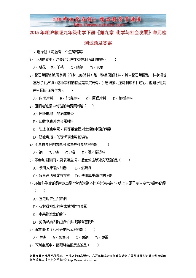 2015年新沪教版九年级化学下册《第九章 化学与社会发展》单元检测试题及答案