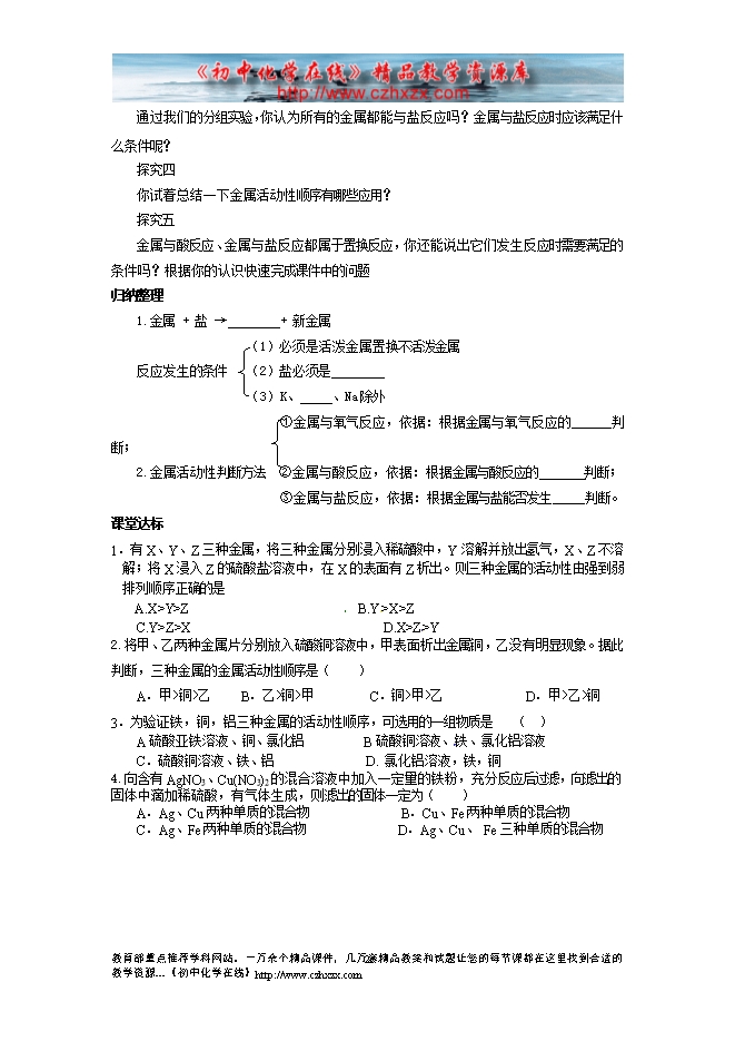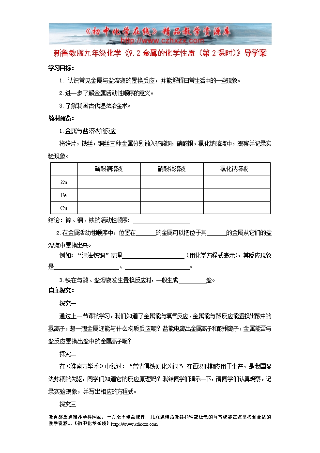 新鲁教版九年级化学《9.2金属的化学性质(第2课时)》导学案