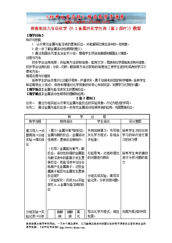 新鲁教版九年级化学《9.2金属的化学性质(第2课时)》教案