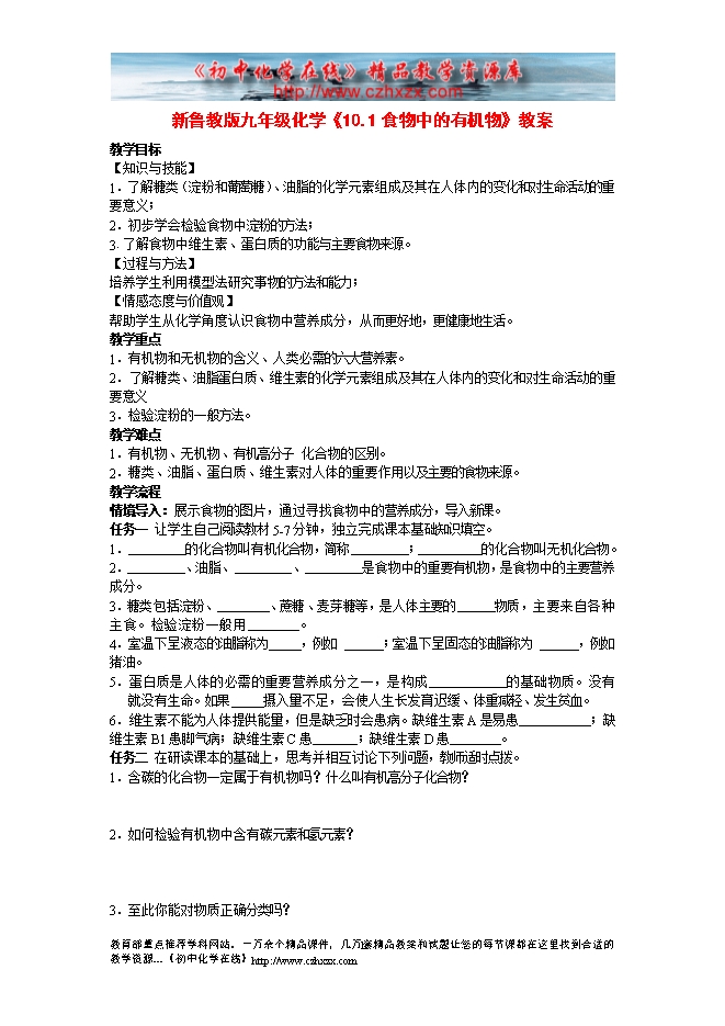 新鲁教版九年级化学《10.1食物中的有机物》教案