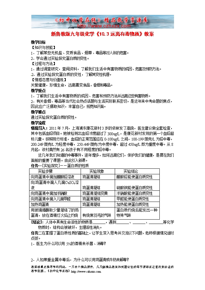 新鲁教版九年级化学《10.3远离有毒物质》教案