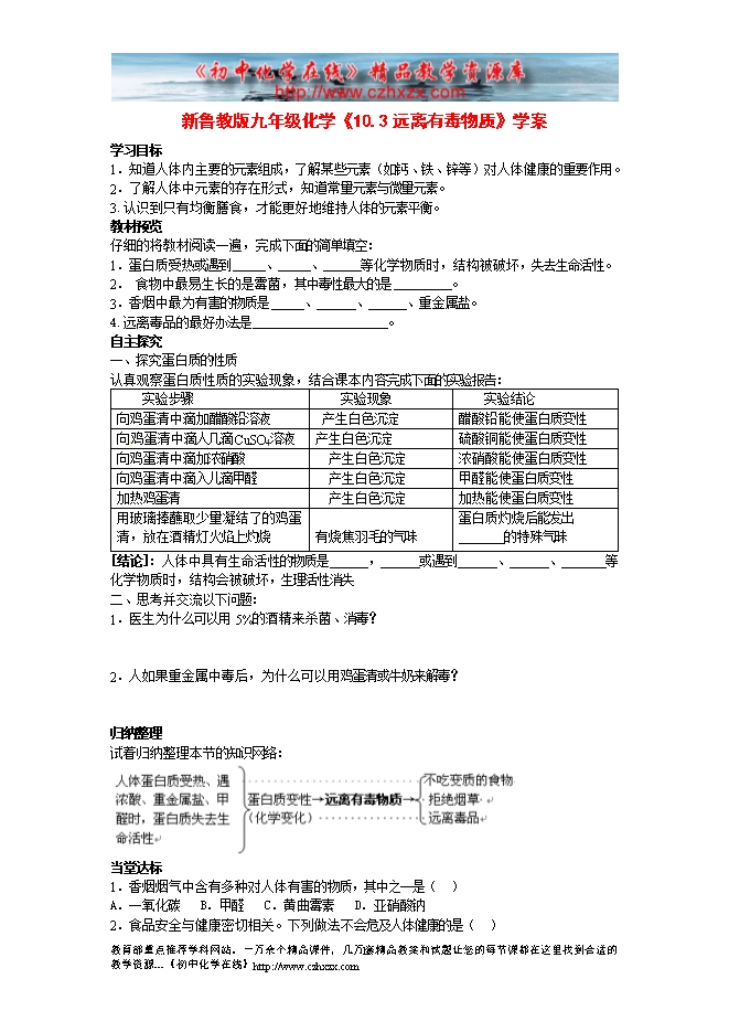 新鲁教版九年级化学《10.3远离有毒物质》学案