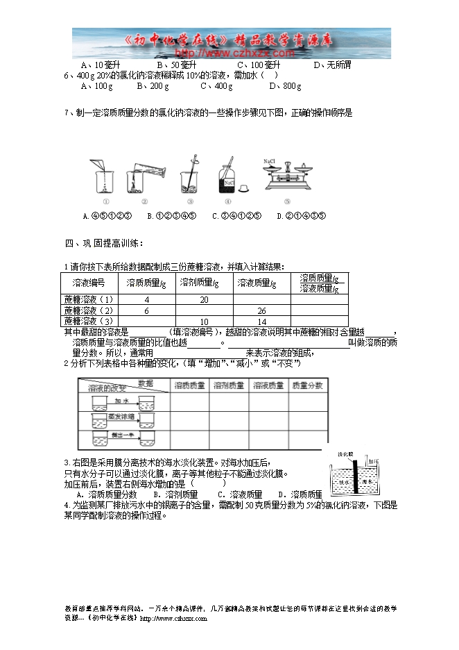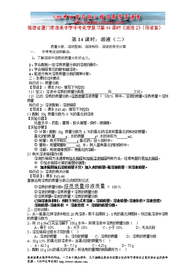 福建省厦门市莲美中学中考化学复习第14课时《溶液2》(导读案)