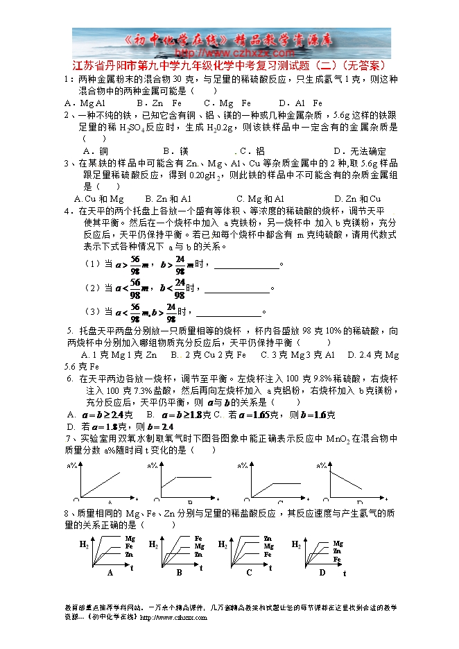 江苏省丹阳市第九中学九年级化学中考复习测试题(二)(无答案)