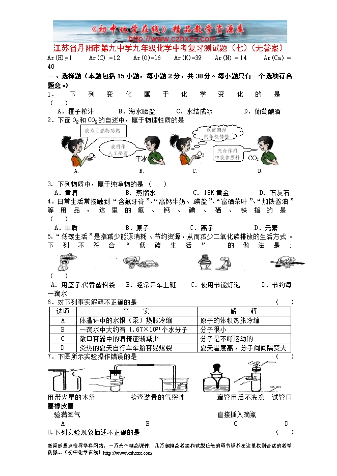 江苏省丹阳市第九中学九年级化学中考复习测试题(七)(无答案)