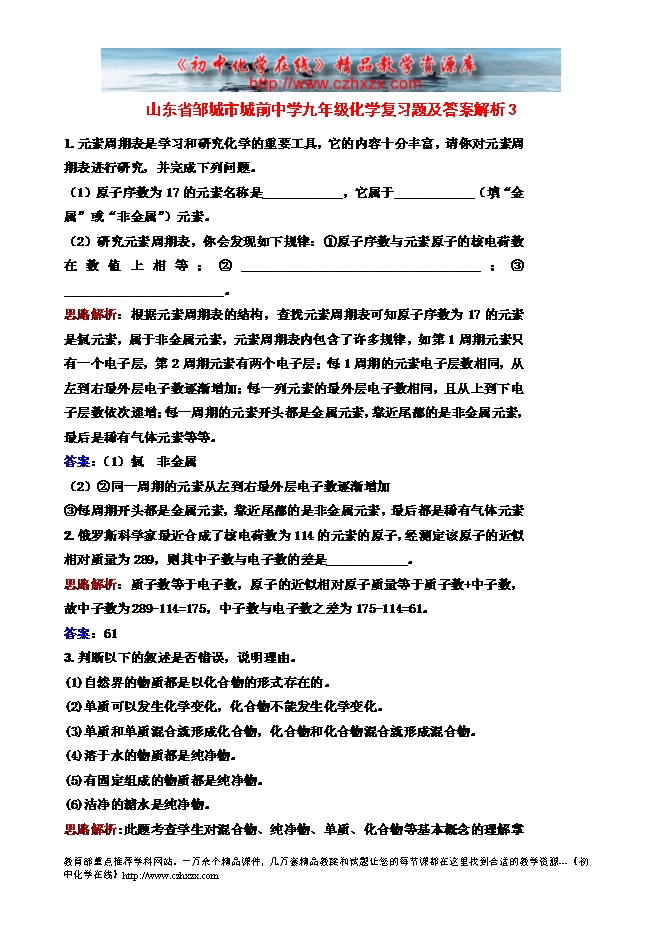 山东省邹城市城前中学九年级化学复习题及答案解析3
