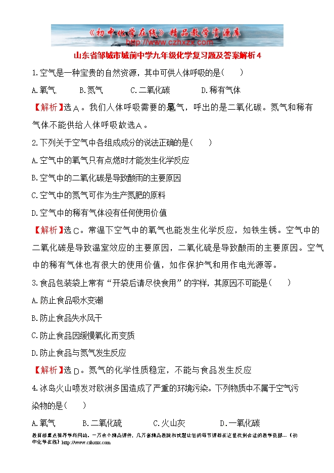 山东省邹城市城前中学九年级化学复习题及答案解析4