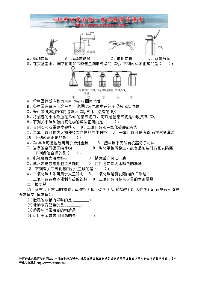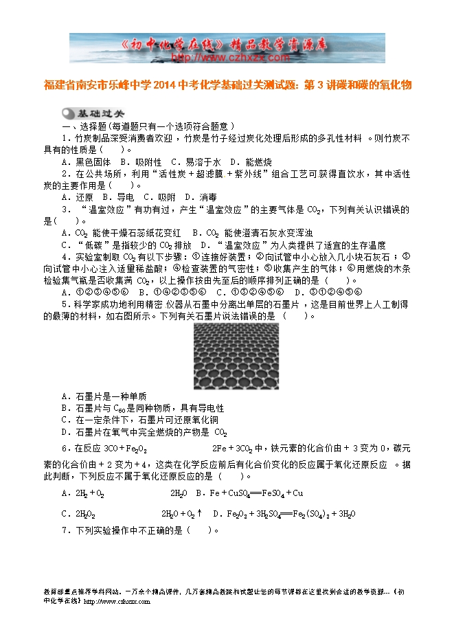 福建省南安市乐峰中学2014中考化学基础过关测试题:第3讲 碳和碳的氧化物