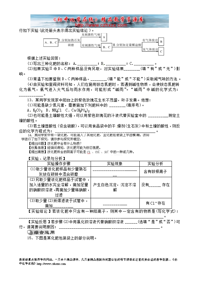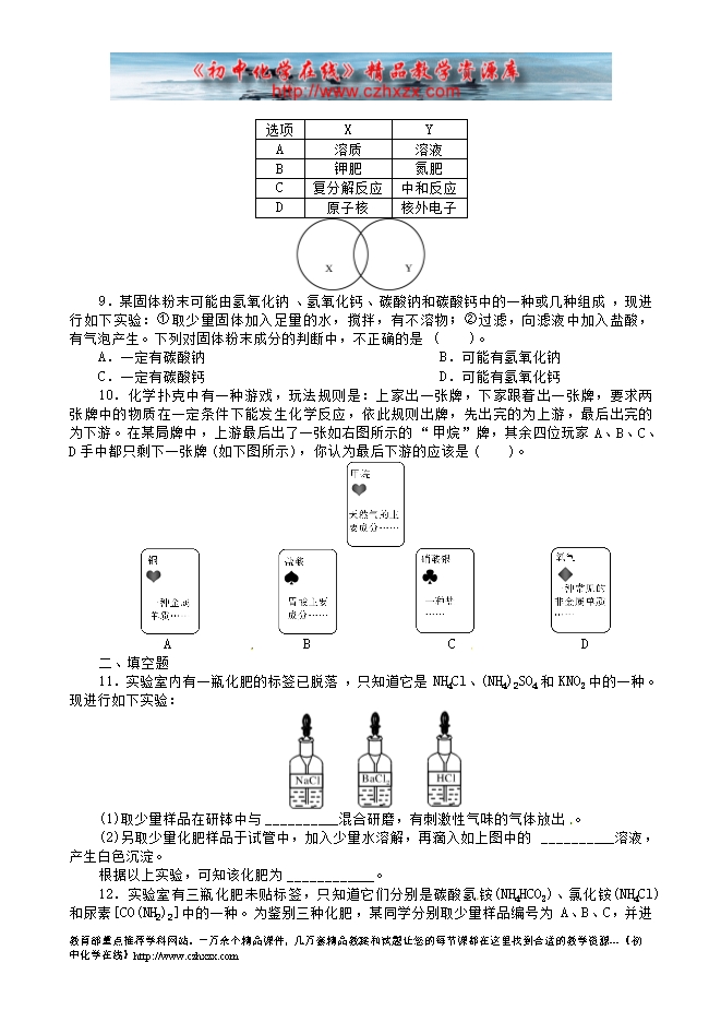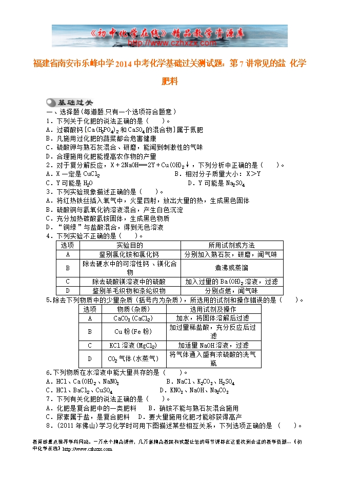 福建省南安市乐峰中学2014中考化学基础过关测试题:第7讲 常见的盐 化学肥料