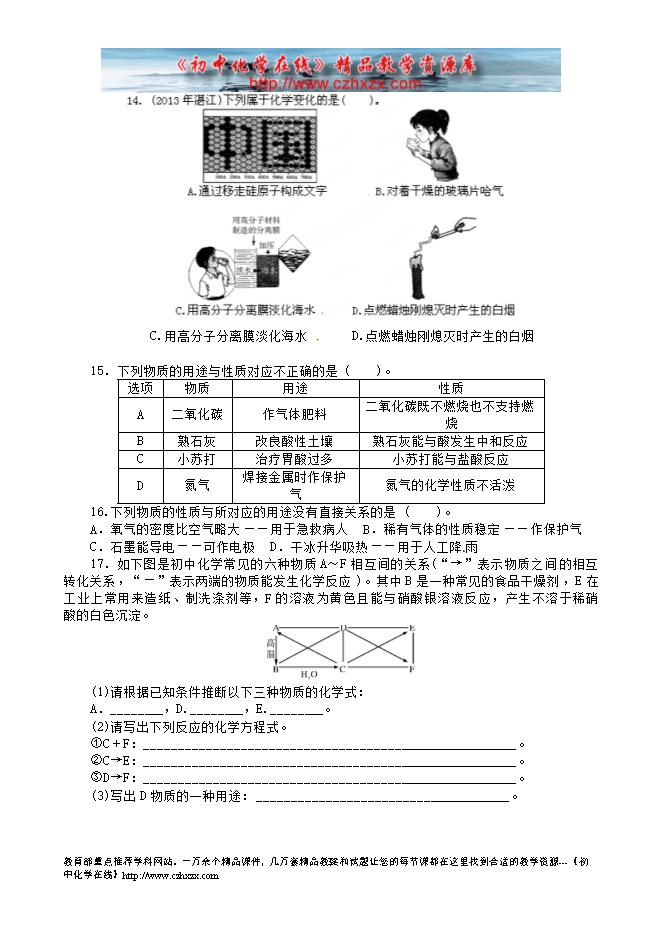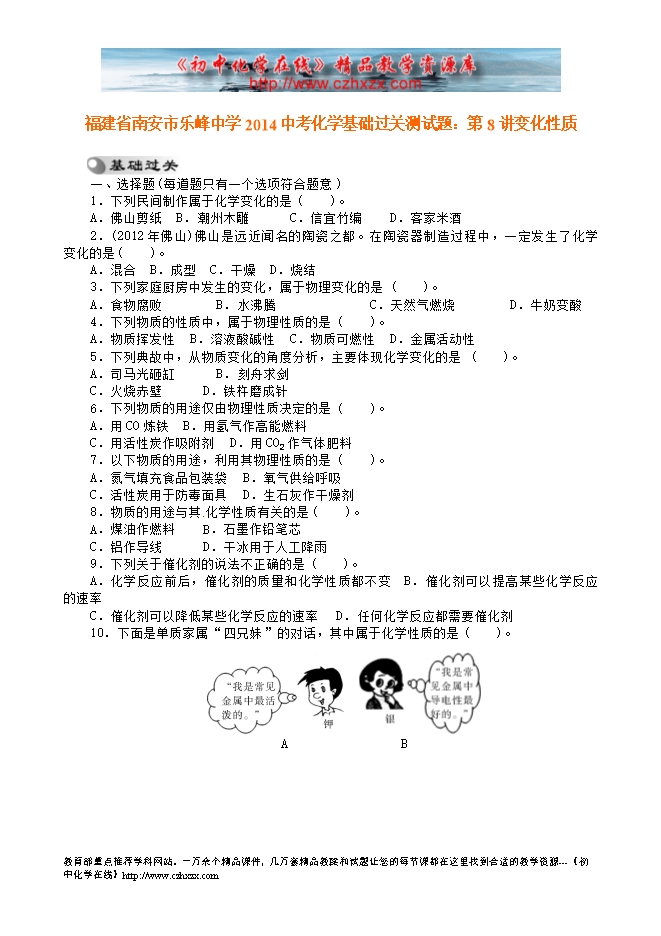 福建省南安市乐峰中学2014中考化学基础过关测试题:第8讲 变化性质