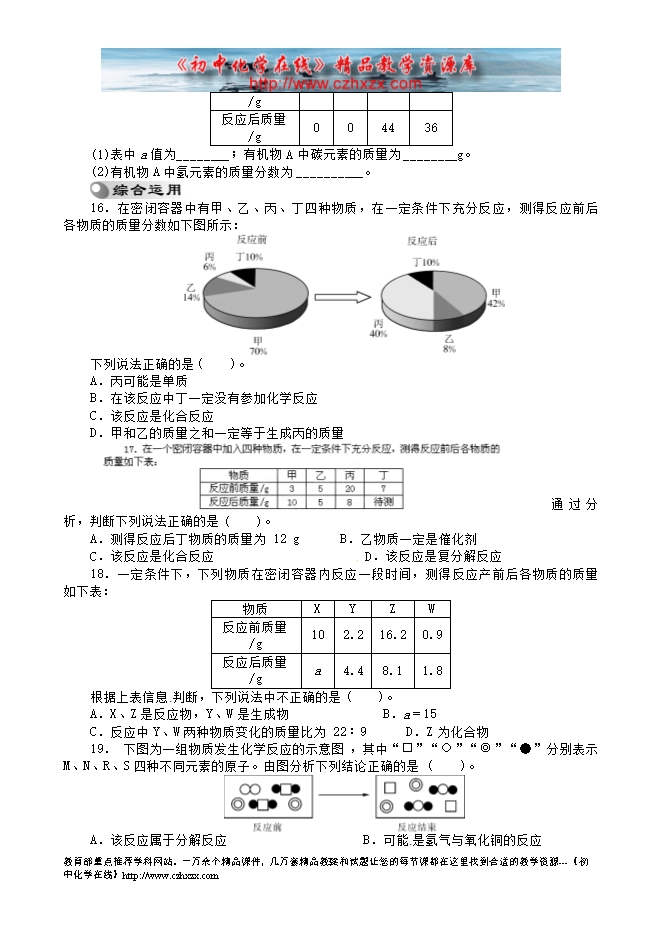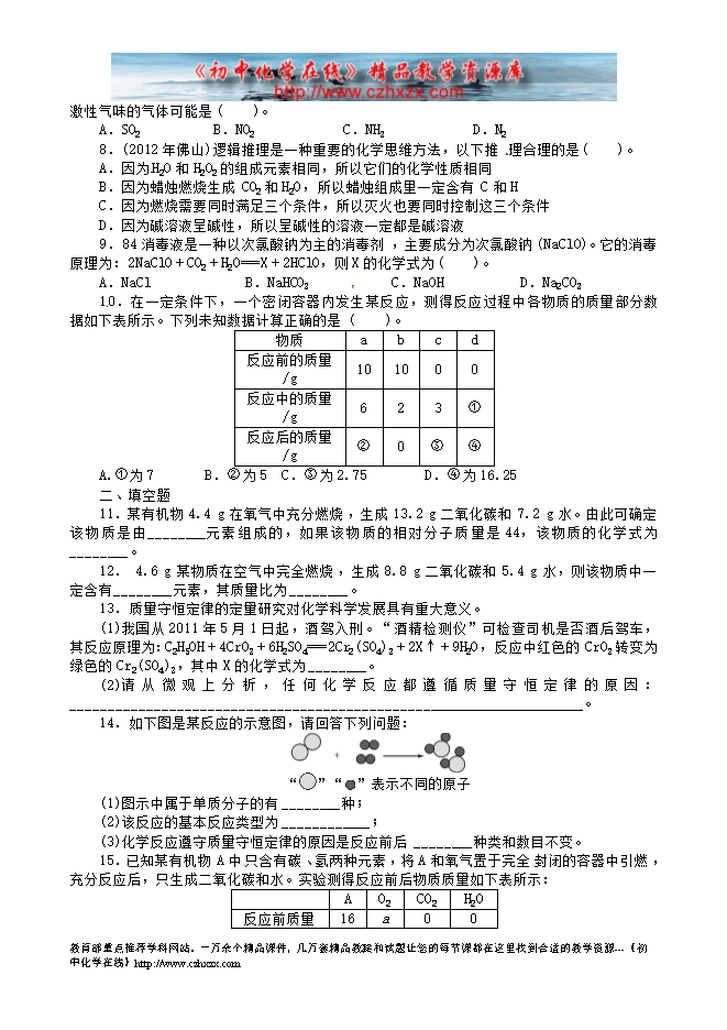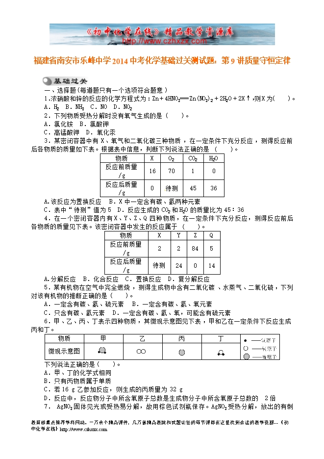 福建省南安市乐峰中学2014中考化学基础过关测试题:第9讲 质量守恒定律