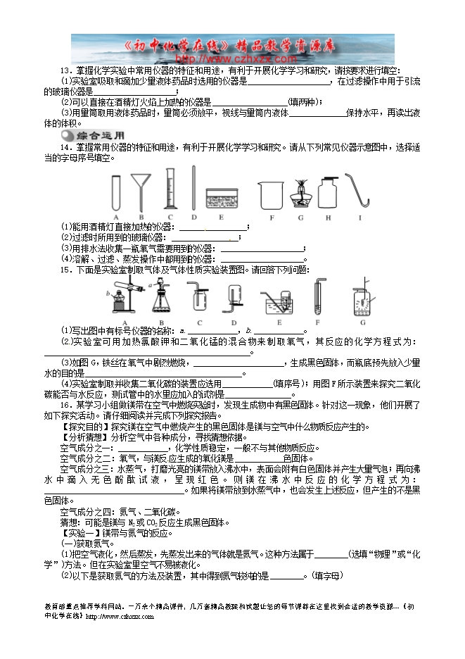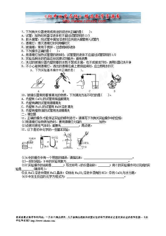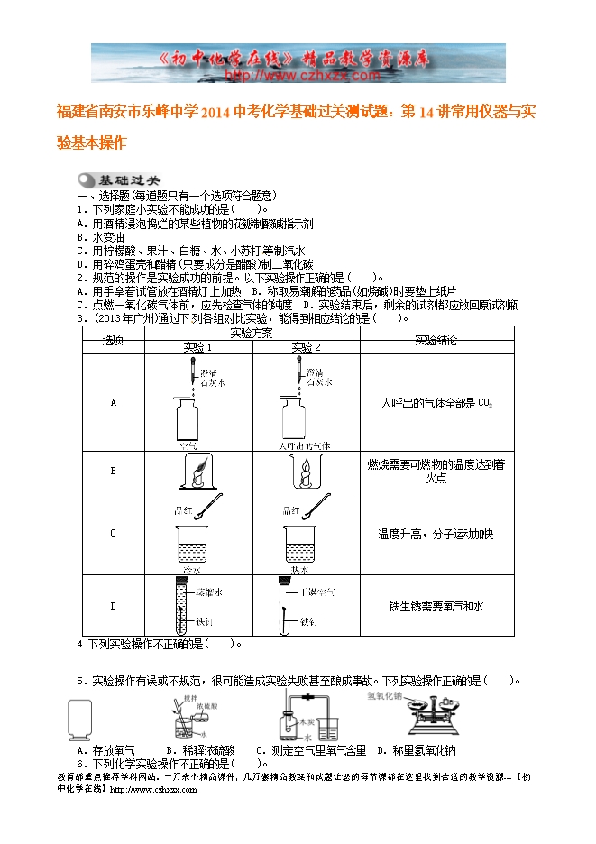 福建省南安市乐峰中学2014中考化学基础过关测试题:第14讲 常用仪器与实验基本操作