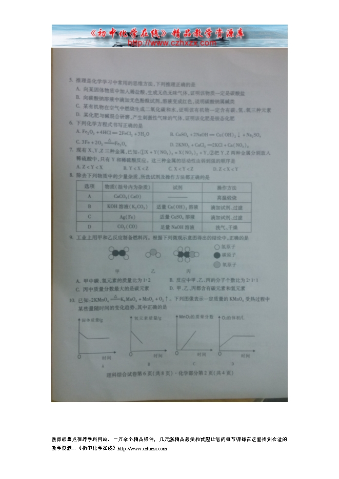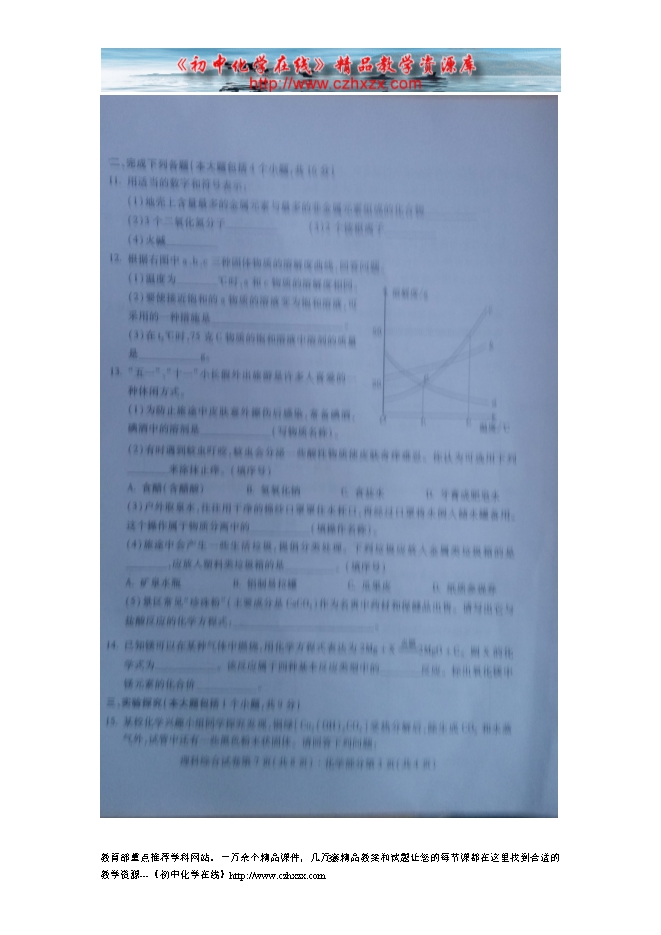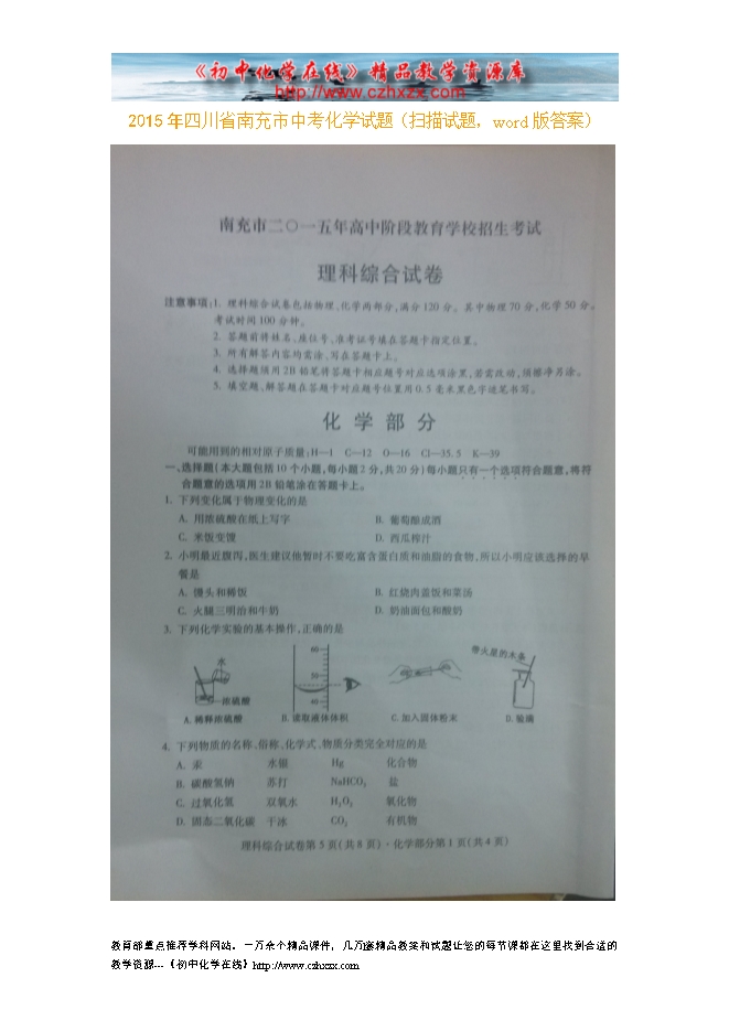 2015年四川省南充市中考化学试题(扫描试题,word版答案)