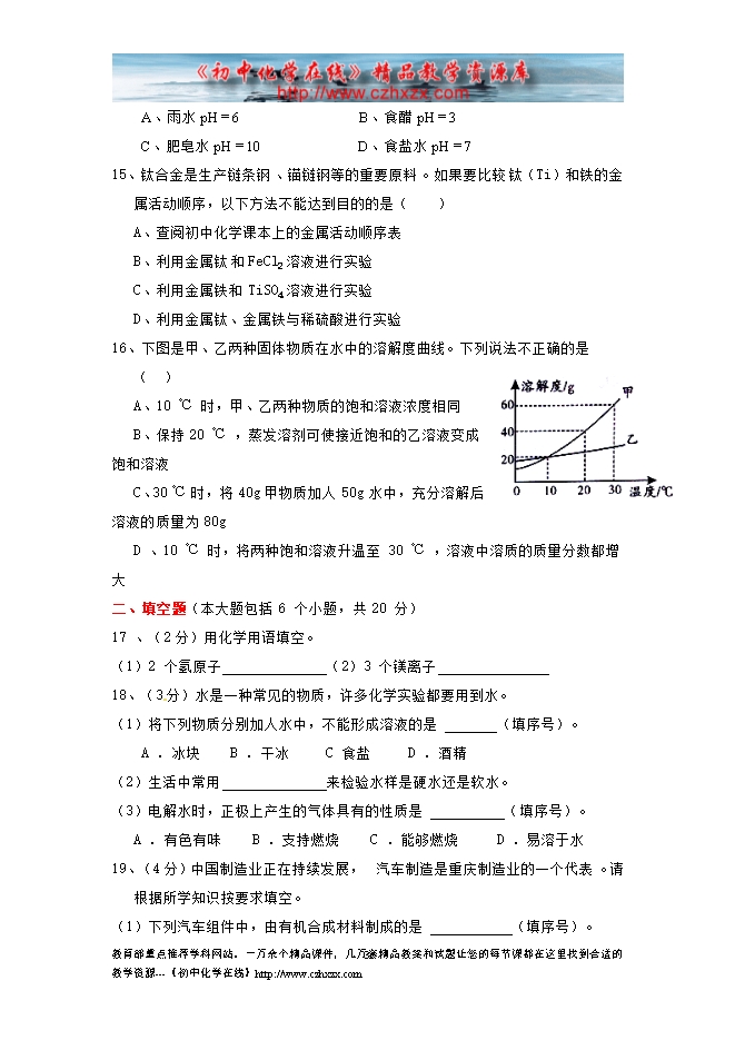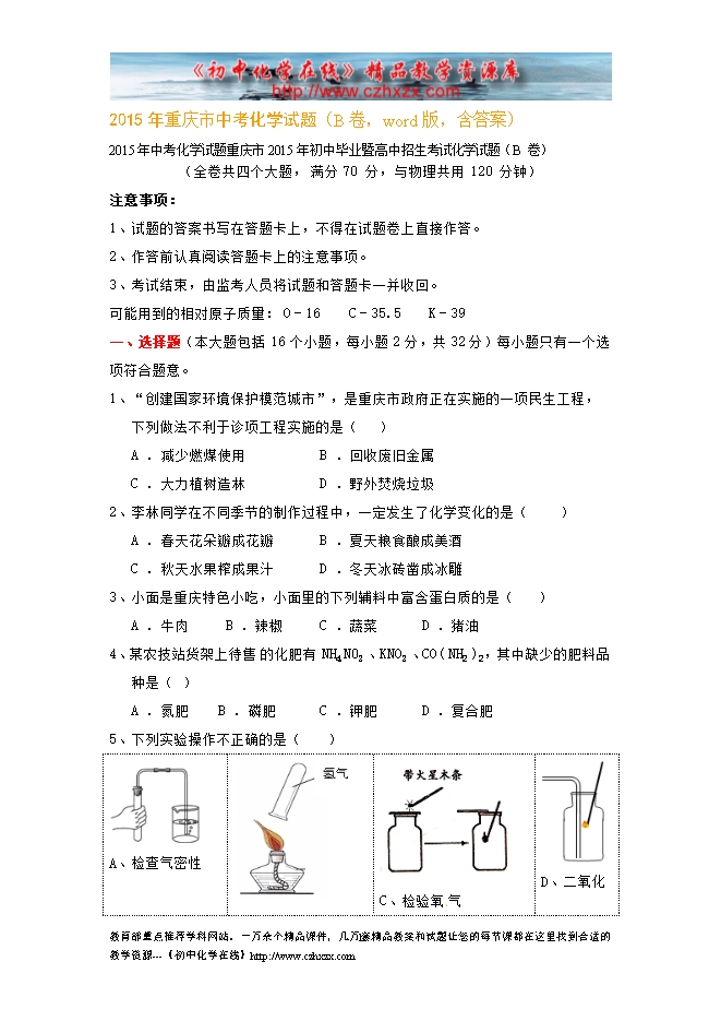 2015年重庆市中考化学试题(B卷,word版,含答案)