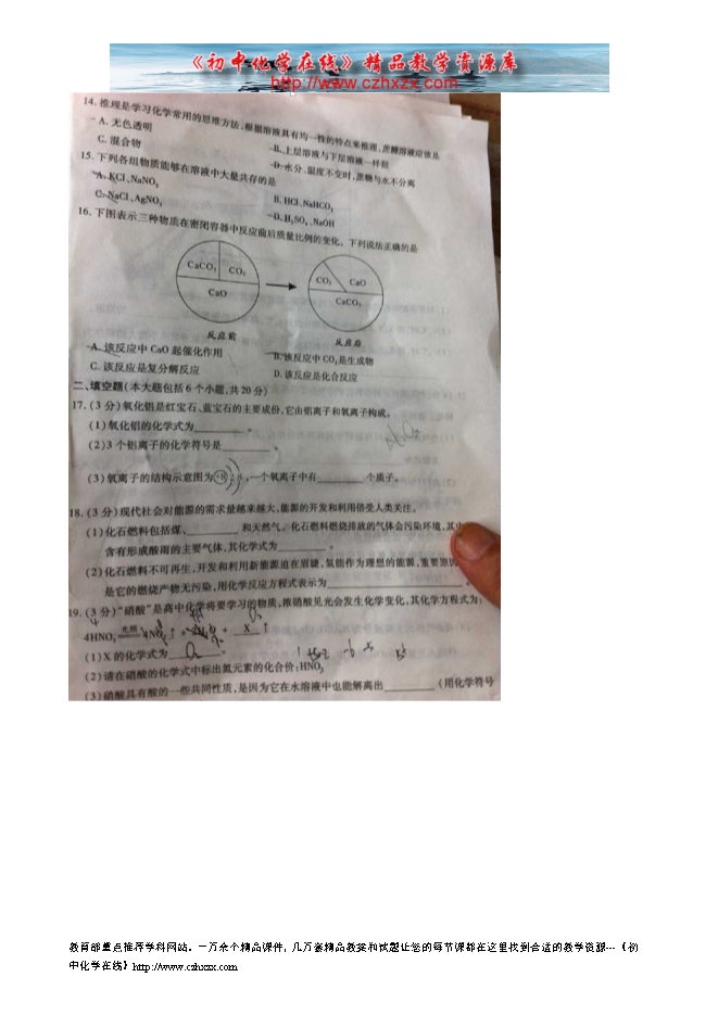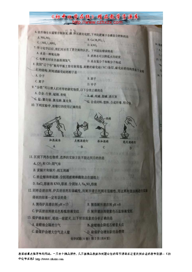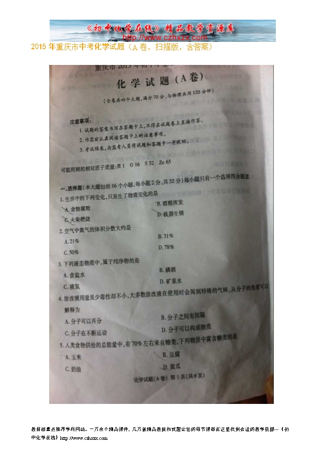 2015年重庆市中考化学试题(A卷,扫描版,含答案)