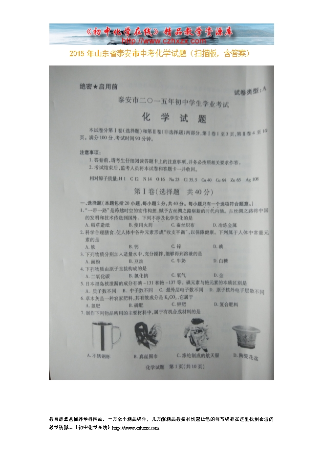 2015年山东省泰安市中考化学试题(扫描版,含答案)
