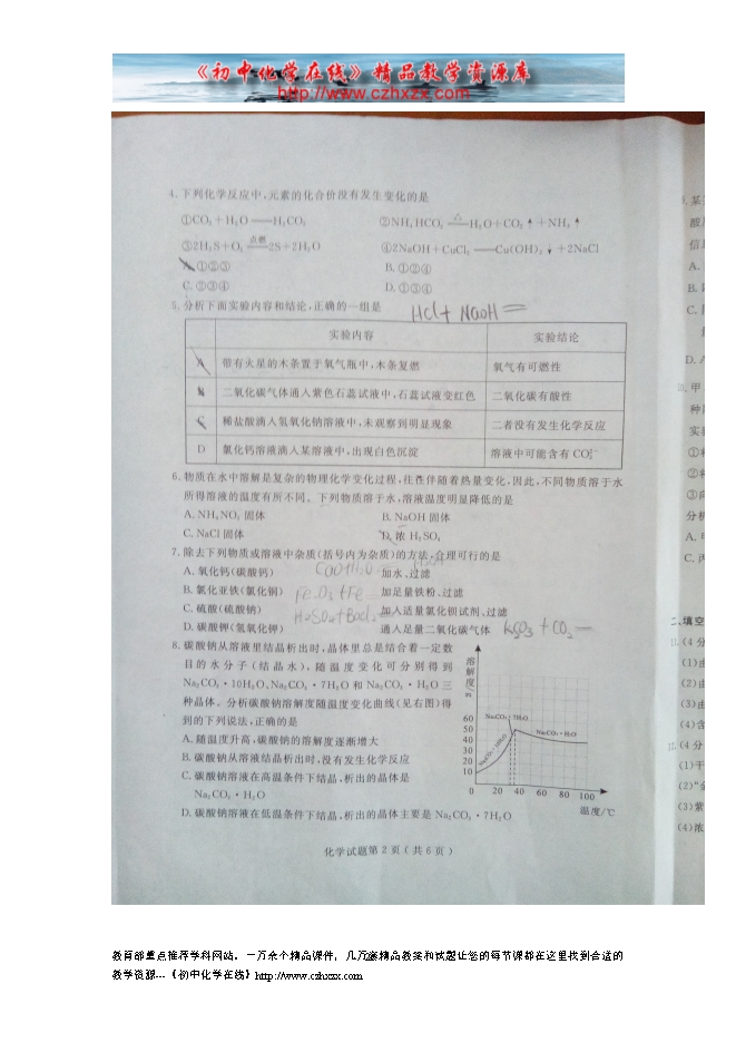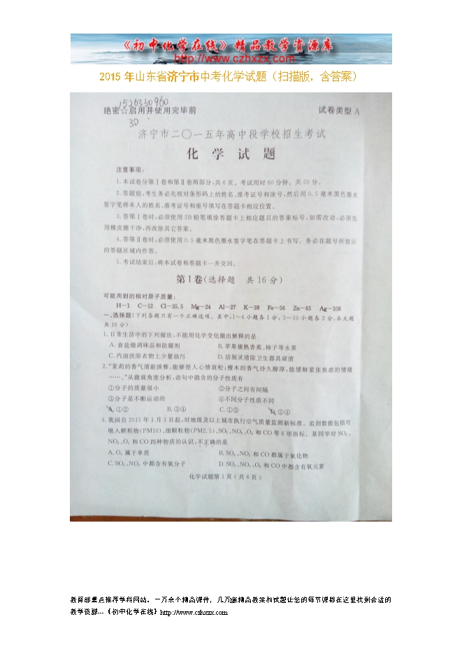 2015年山东省济宁市中考化学试题(扫描版,含答案)