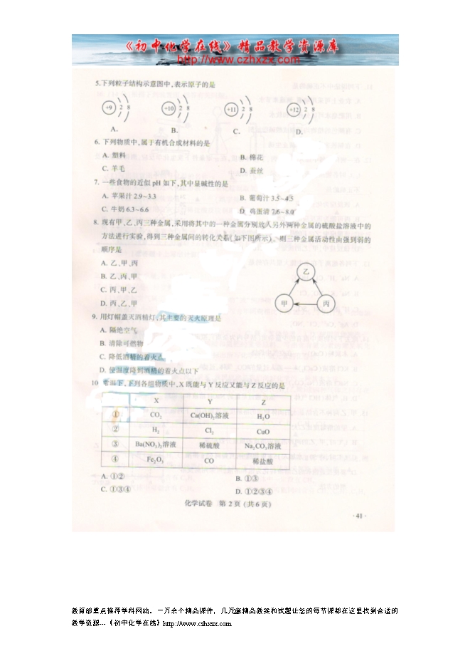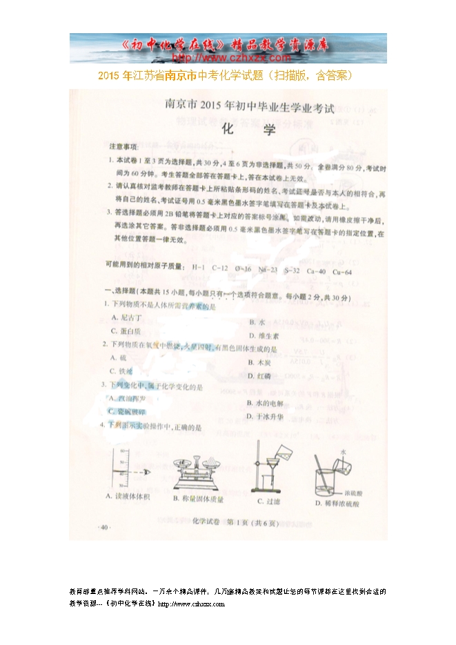 2015年江苏省南京市中考化学试题(扫描版,含答案)