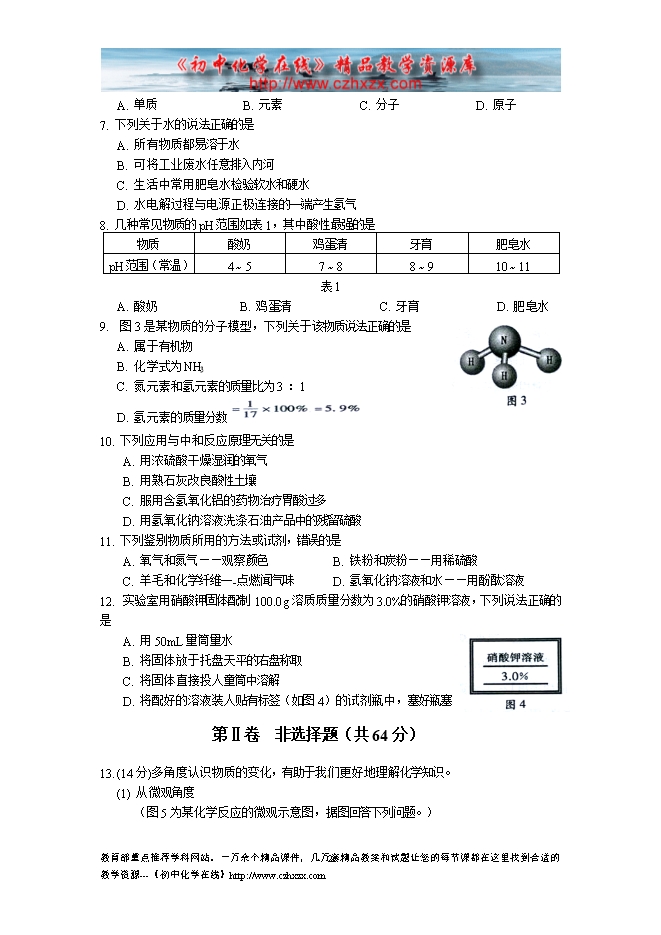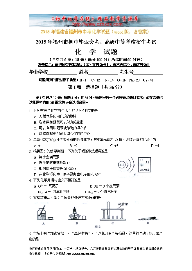- 上一份试卷:2015年江苏省南京市中考化学试题(扫描版,含答案)