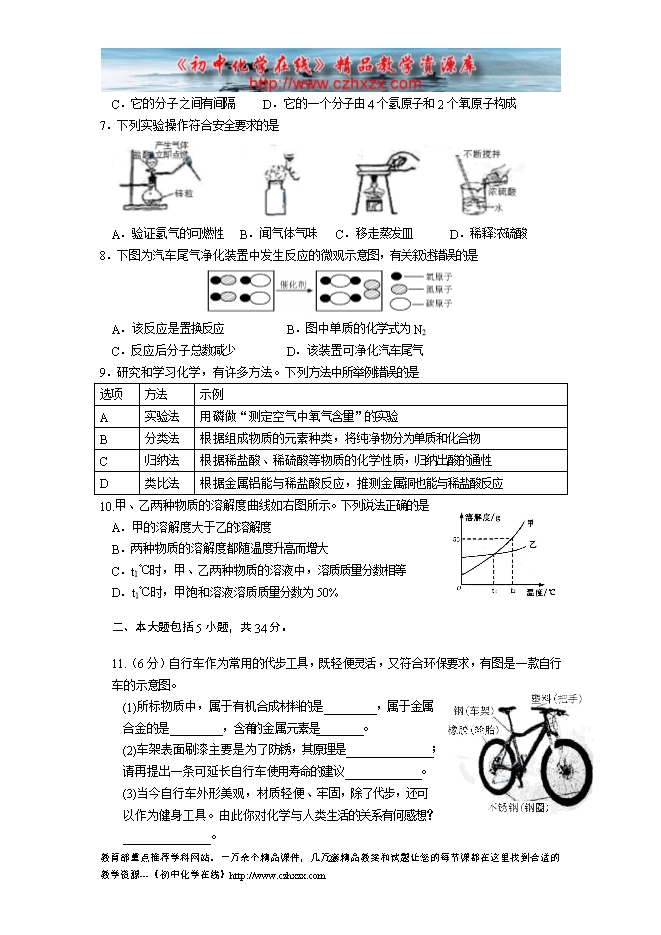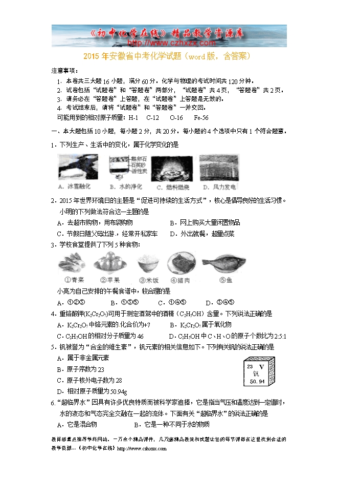 2015年安徽省中考化学试题(word版,含答案)