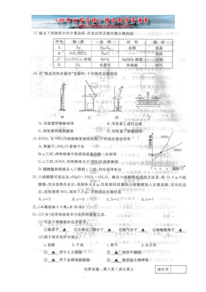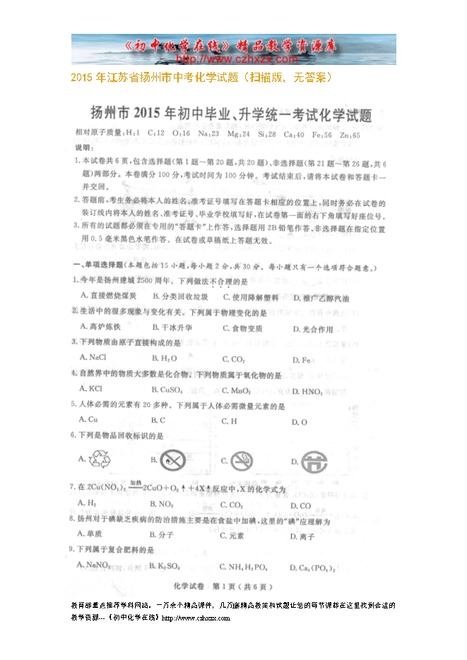 2015年江苏省扬州市中考化学试题(扫描版,无答案)
